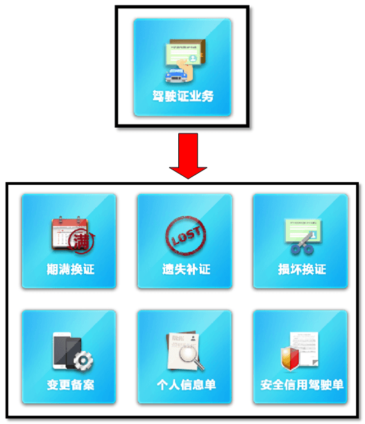 駕駛證自助辦證機可辦理駕駛證、交通違法兩大業(yè)務,具體如下圖所示: