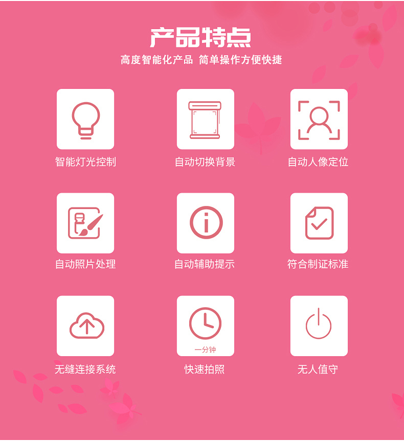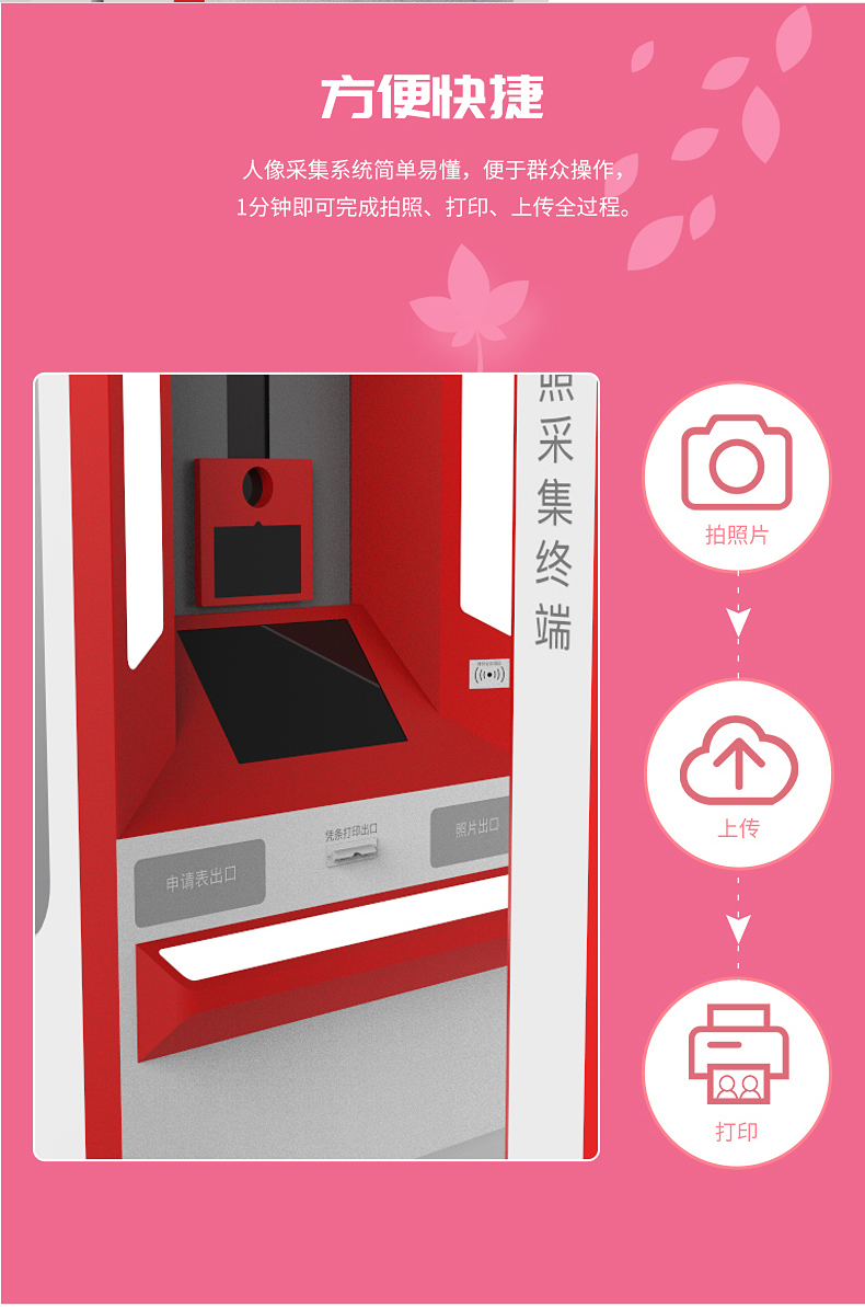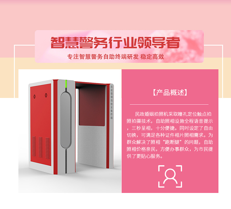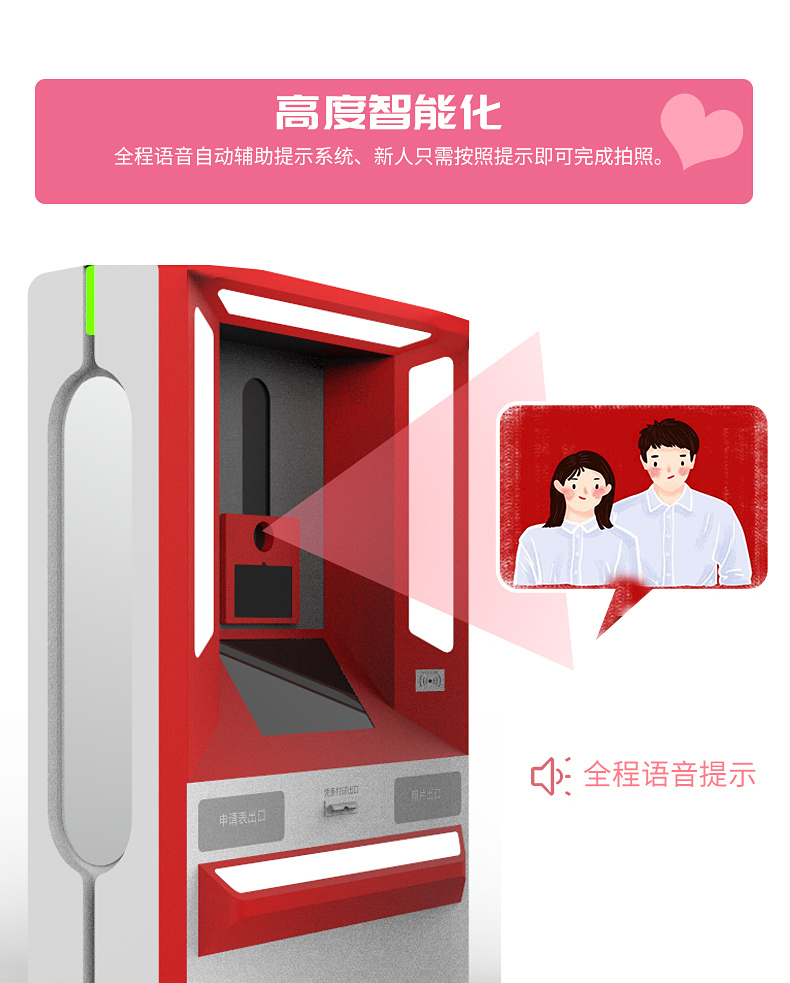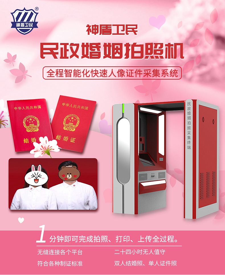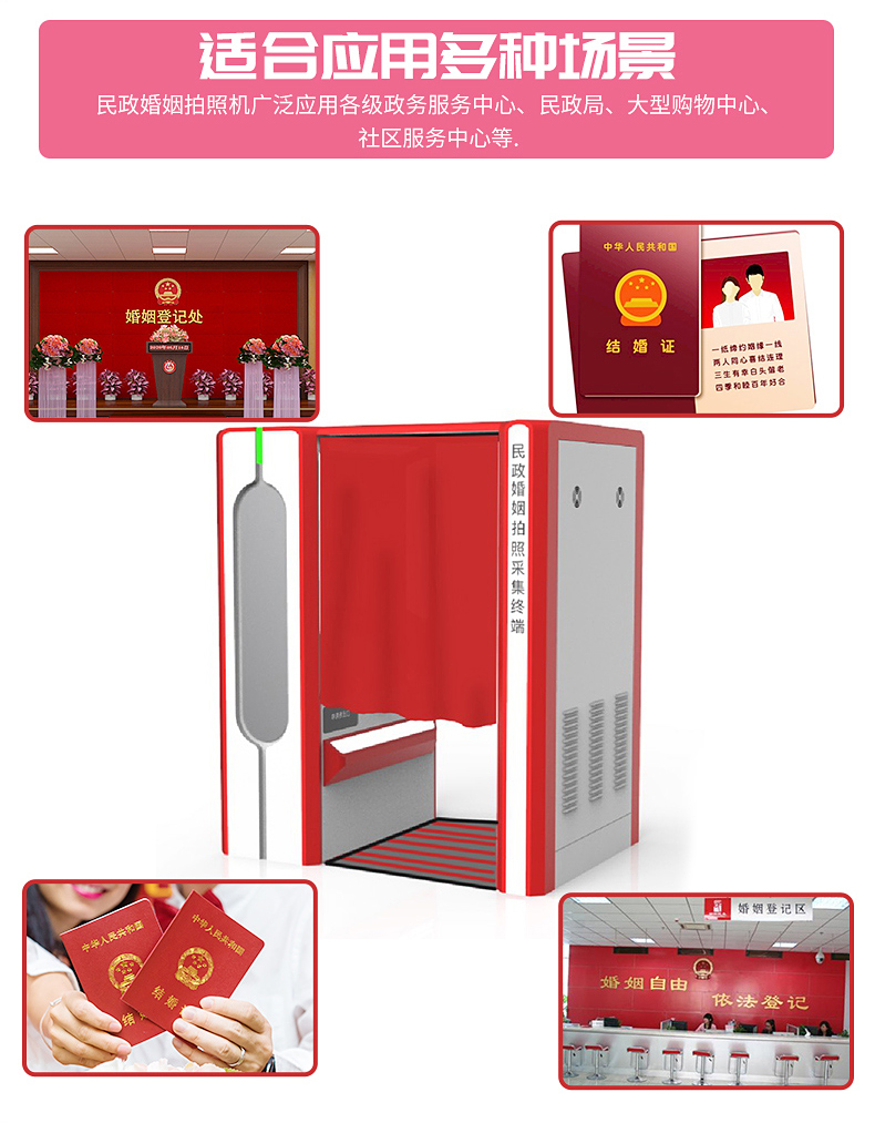 婚姻拍照機廣泛用于民政婚姻登記處,婚姻拍照機采取瞳孔定位觸點拍照拍攝技術(shù),自助照相設(shè)施全程語音提示,三秒呈相,十分便捷。同時設(shè)定了自由切換,可滿足雙人(結(jié)婚)、單人(離婚)照相需求。自助拍照機外型簡潔大方,色彩基調(diào)符合辦證大廳形象。