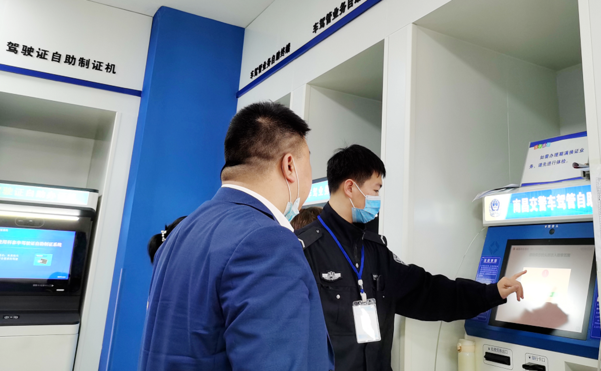 在南昌市智慧車管所,領(lǐng)導(dǎo)們零距離了解了神盾衛(wèi)民投放的預(yù)約導(dǎo)航分流取號(hào)系統(tǒng)、流動(dòng)服務(wù)車及拍照、體檢、受理、制證、號(hào)牌發(fā)證