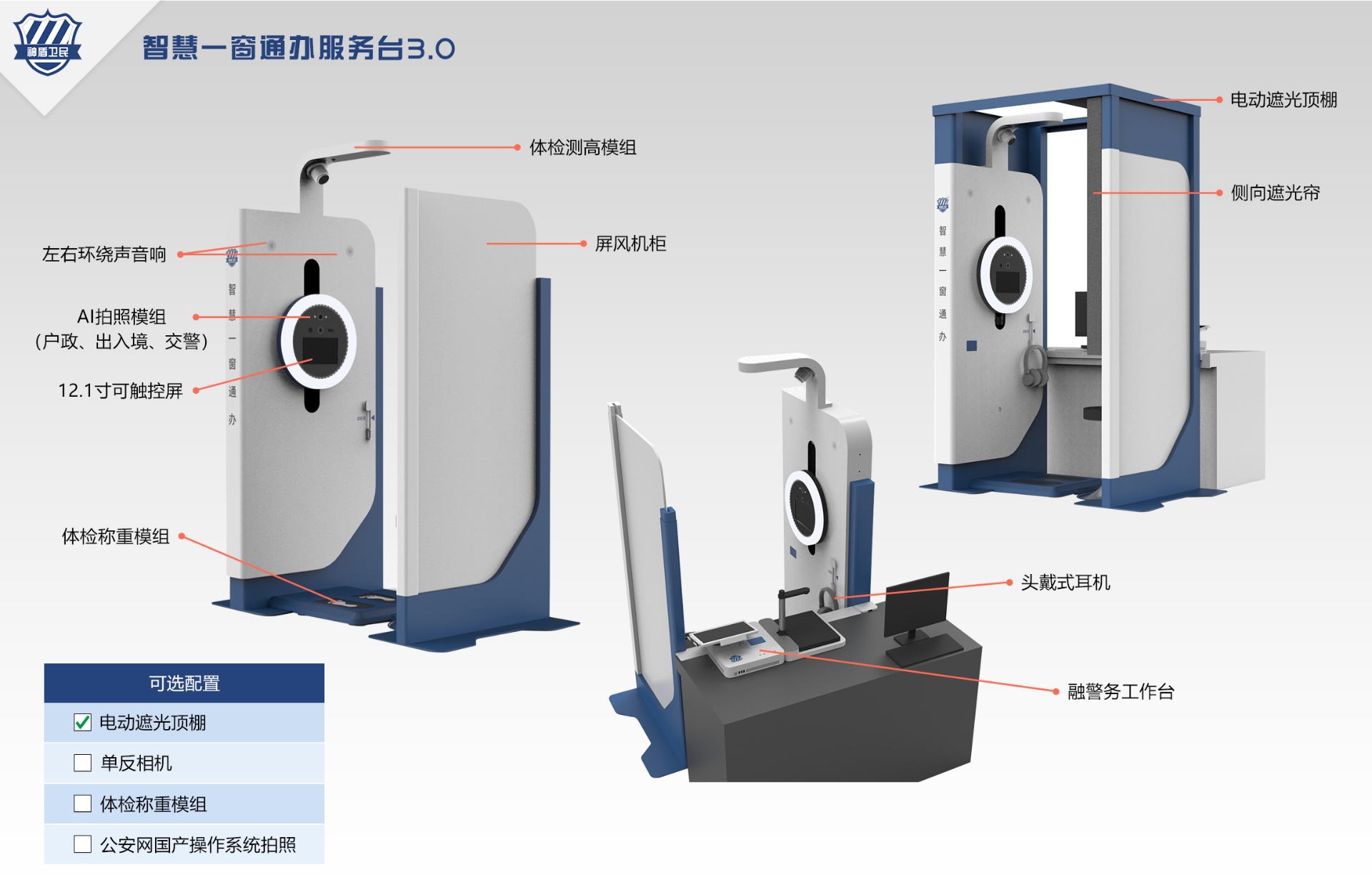 神盾衛(wèi)民智慧一窗通辦具有“證件照自動拍、駕駛證體檢、身份證閱讀、電子填表、指紋采集、材料電子拍攝、電子簽名、電子繳費、陽光評價”等功能; 3.0版,則可靈選擇更多配置。