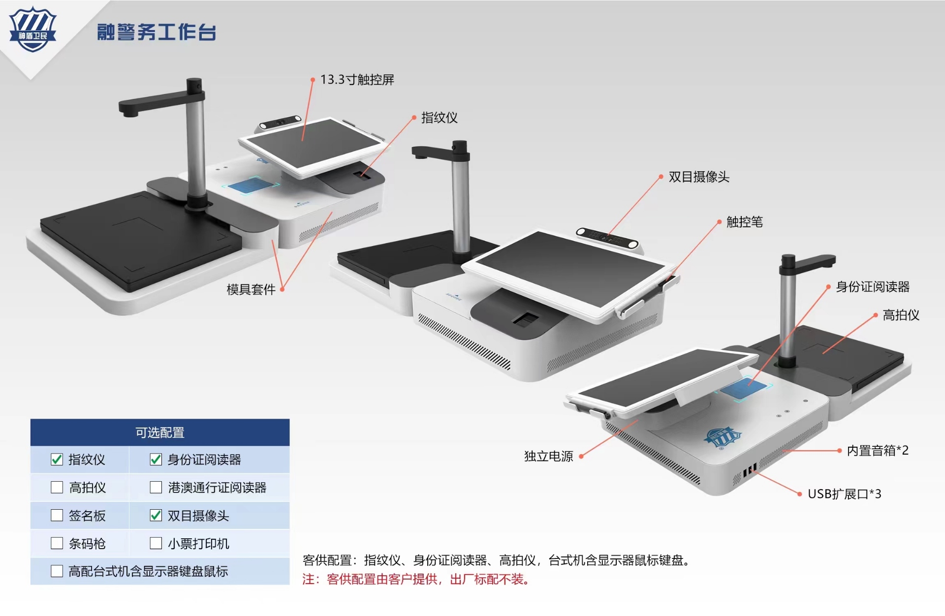 可選配置:高配 臺式機含顯示器鍵盤鼠標、身份證閱讀器、港澳通行證閱讀器、指紋儀(身份證指紋儀、出入境指紋儀)、高拍儀(支持接入交警業(yè)務系統(tǒng),支持A3)、雙目攝像頭、簽名板、條碼槍、小票打印機