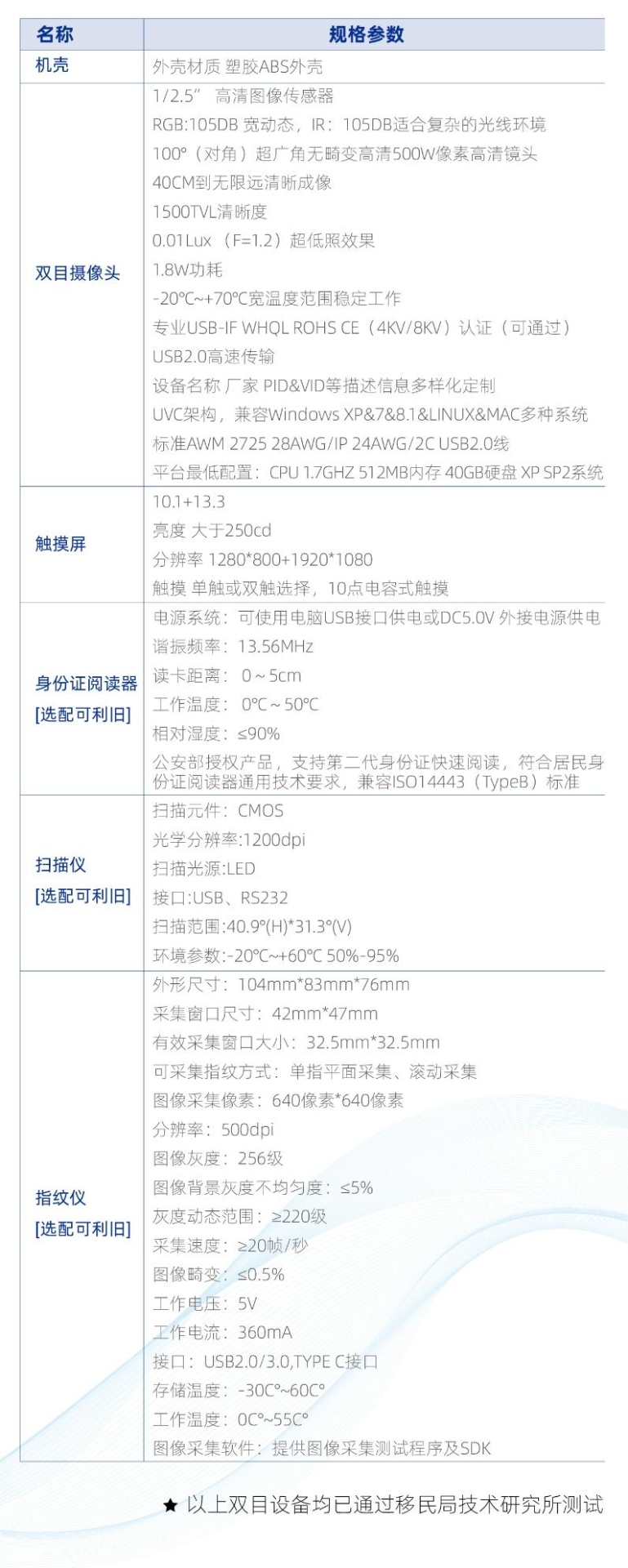 【1】說明          設(shè) 備 集 雙 目 500 萬 寬 動 態(tài) 攝 像 頭 、 指 紋 儀 采 集 儀 、 身 份 證 閱 讀 器 、 手 寫 簽 名 、窗 口 評 價 、 揚 聲 器 于 一 體 的 窗 口 綜 合 集 成 設(shè) 備 , 設(shè) 備 采 用 精 巧 、 折 疊 式 的 設(shè) 計 , 造 型 簡潔 簡 單 實 用 。支 持 標 準 的 USB 通 訊 方 式、支 持 人 臉 采 集 、 人 臉比 對 、 人 證 核 驗、活 體 檢 測 、 身 份 證 閱 讀 , 采 集 生物 特 征 信 息 等 功 能 ,支持 Windows 、Android、Linux 系統(tǒng)二 次 開 發(fā) 集 成 。