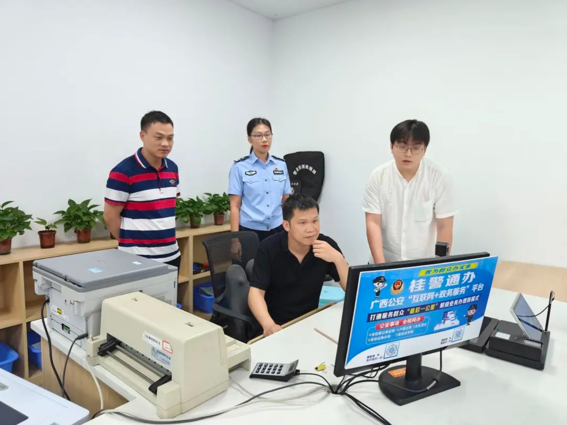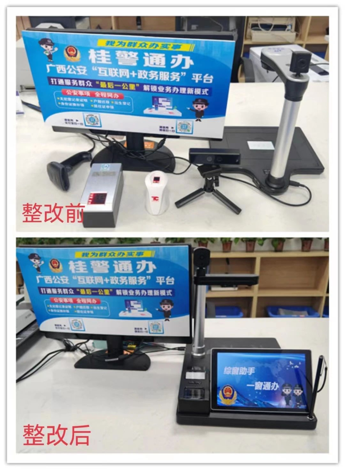 為深入推進(jìn)“創(chuàng)人民滿意公安”活動(dòng),港北分局在著力提升服務(wù)效能上下功夫,讓“三合一”“一窗通辦”服務(wù)再延伸,在港北辦證服務(wù)大廳引進(jìn)廣西首套“一窗通辦辦公臺(tái)”。     “一窗通辦辦公臺(tái)”也叫“一窗通辦AI拍照一體機(jī)”。該設(shè)備不僅能在前臺(tái)窗口直接完成戶籍、交管、出入境三個(gè)警種業(yè)務(wù)的相片采集,同時(shí)整合三個(gè)警種業(yè)務(wù)所需的指紋采集、證件芯片讀取、電磁手寫、證據(jù)采集等功能一體機(jī)。設(shè)備引進(jìn)安裝后,在市局滿意辦和戶政科的協(xié)調(diào)下,港北辦證服務(wù)大廳的“一窗通辦辦公臺(tái)”已完成與人口信息管理系統(tǒng)、公安交通管理綜合應(yīng)用平臺(tái)、全國(guó)公安出入境管理信息系統(tǒng)公安廳三個(gè)警種部門的業(yè)務(wù)對(duì)接。此套設(shè)備的投入使用,改變了原來“三合一”業(yè)務(wù)窗口桌面擺放設(shè)備過多、操作繁瑣等問題。讓窗口桌面保持干凈整潔、民警操作簡(jiǎn)單快捷,減少了群眾的等候時(shí)間更,提高窗口服務(wù)效率。     同時(shí),“一窗通辦辦公臺(tái)”還增加了電子簽名、現(xiàn)場(chǎng)服務(wù)評(píng)價(jià)等功能,為下一步“三合一”業(yè)務(wù)電子檔案完善提升提前做好準(zhǔn)備。