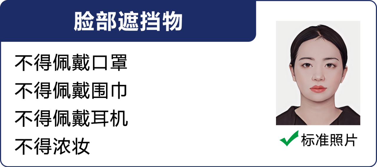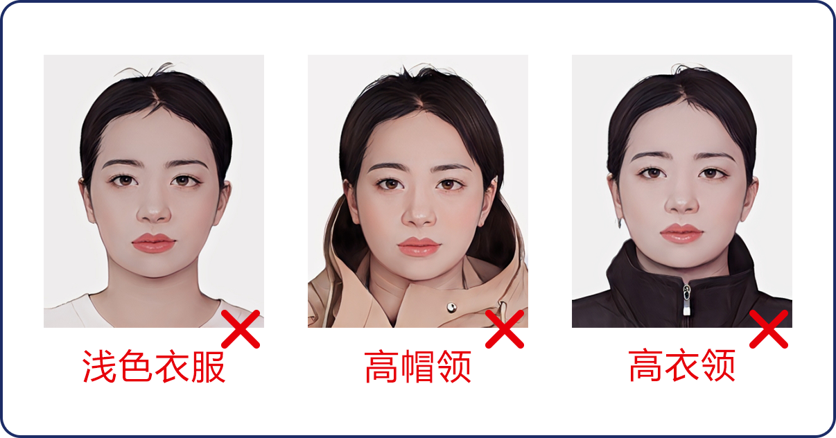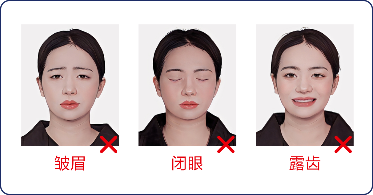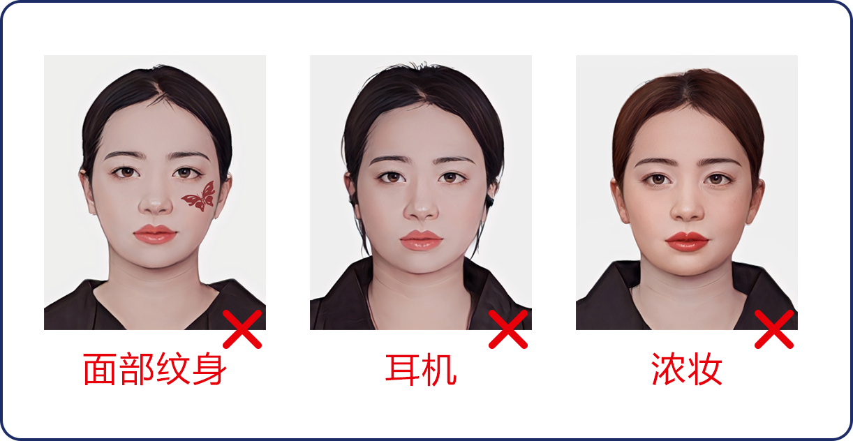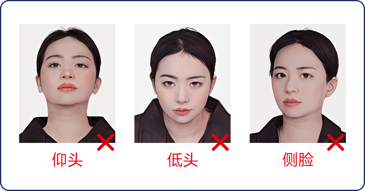 2、在小程序中選擇所需拍攝照片類型,按照系統(tǒng)提示完成拍攝,拍攝過程中,請確保光線充足、純色白墻,背景整潔,避免穿著淺色或帶有明顯圖案的衣物,面部無遮擋,表情自然,不得使用美顏、濾鏡等功能進行處理,拍照注意事項詳見下方照片示例圖,
