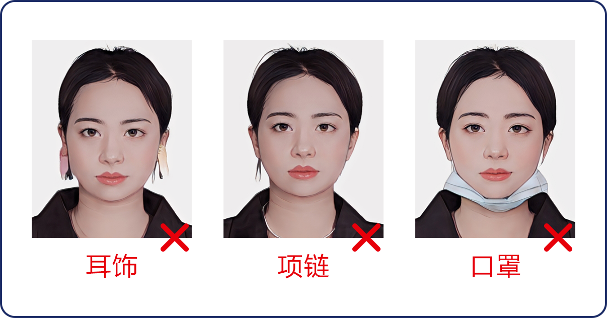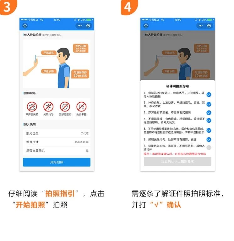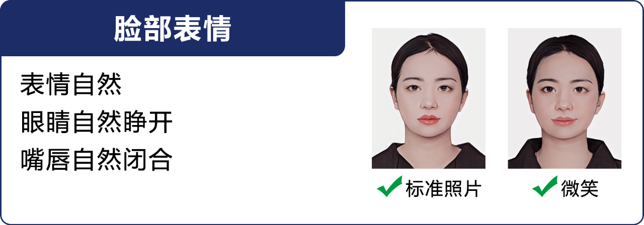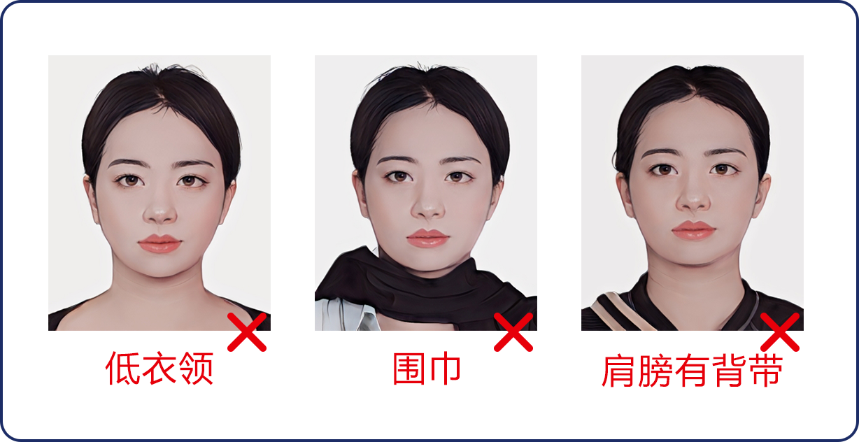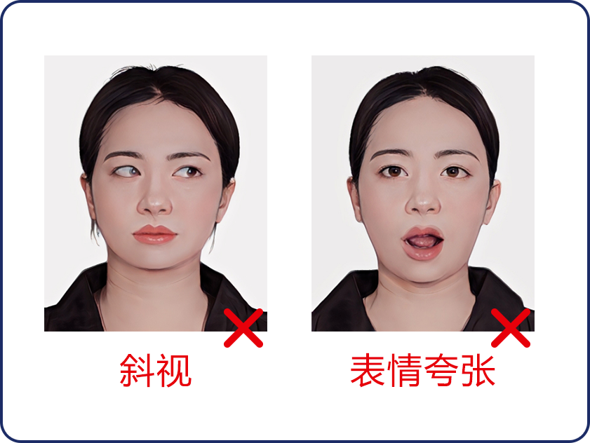 2、在小程序中選擇所需拍攝照片類型,按照系統(tǒng)提示完成拍攝,拍攝過程中,請確保光線充足、純色白墻,背景整潔,避免穿著淺色或帶有明顯圖案的衣物,面部無遮擋,表情自然,不得使用美顏、濾鏡等功能進行處理,拍照注意事項詳見下方照片示例圖,