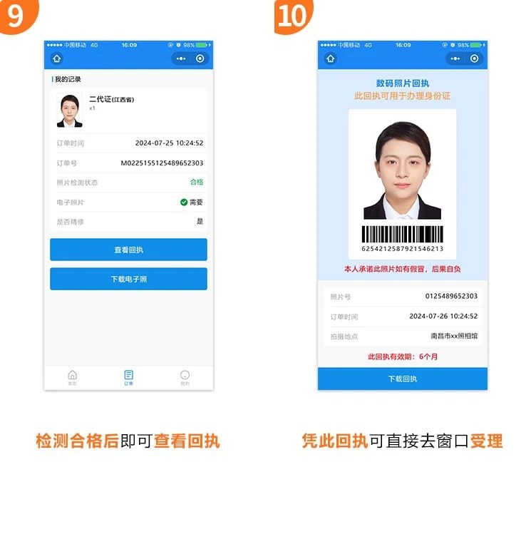 3、照片檢測合格后,可自行下載數(shù)碼照片回執(zhí)和電子照片,申請人可憑此回執(zhí)前往就近的公安機關戶籍窗口辦理身份證申領、補(換)領等業(yè)務。